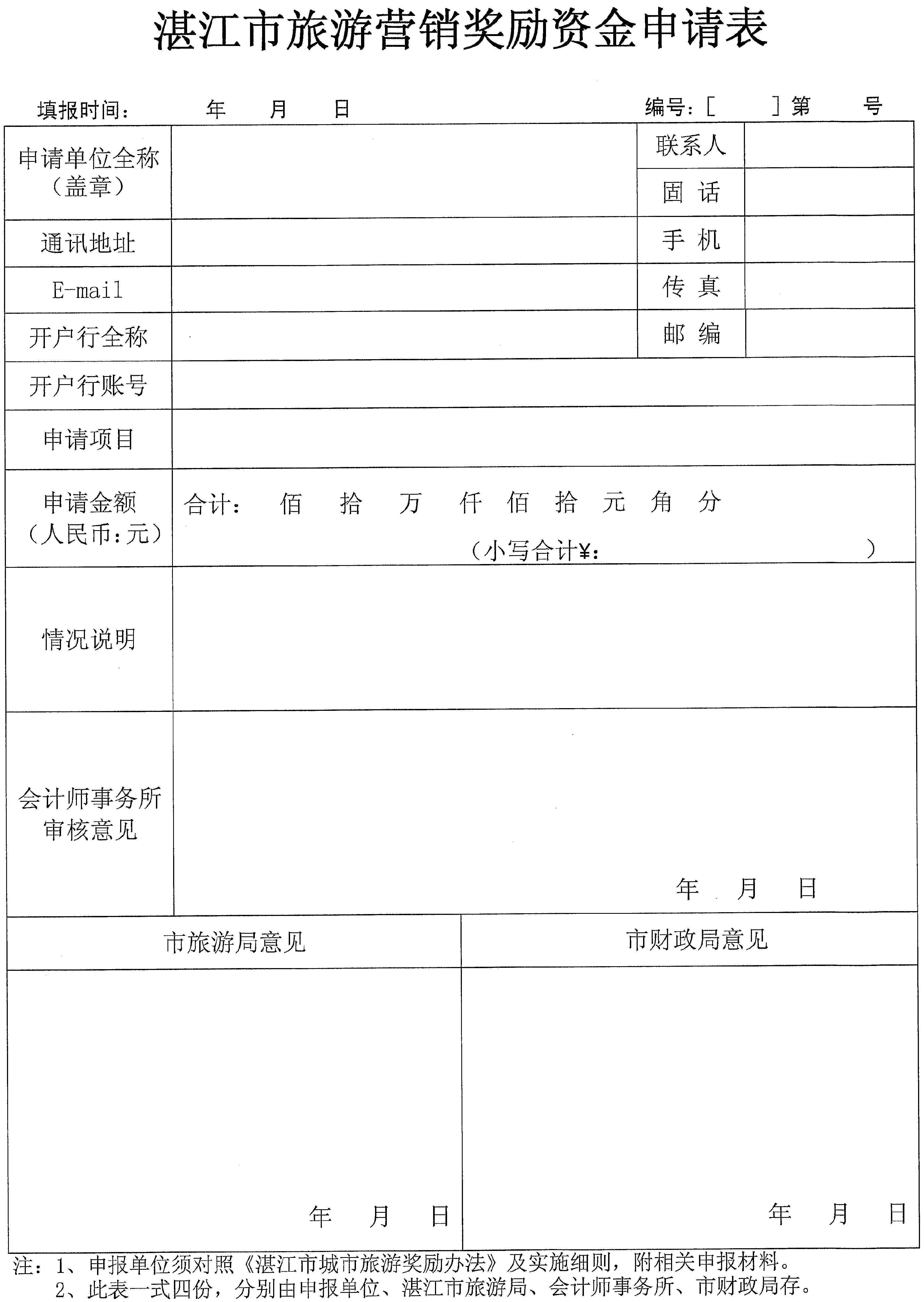 2.需要会计师事务所审核的项目,由申报单位将有关申报材料报送会计师事务所审查。会计师事务所根据审查情况,在《湛江市旅游营销奖励资金申请表》上加盖意见,递交湛江市旅游局核批。