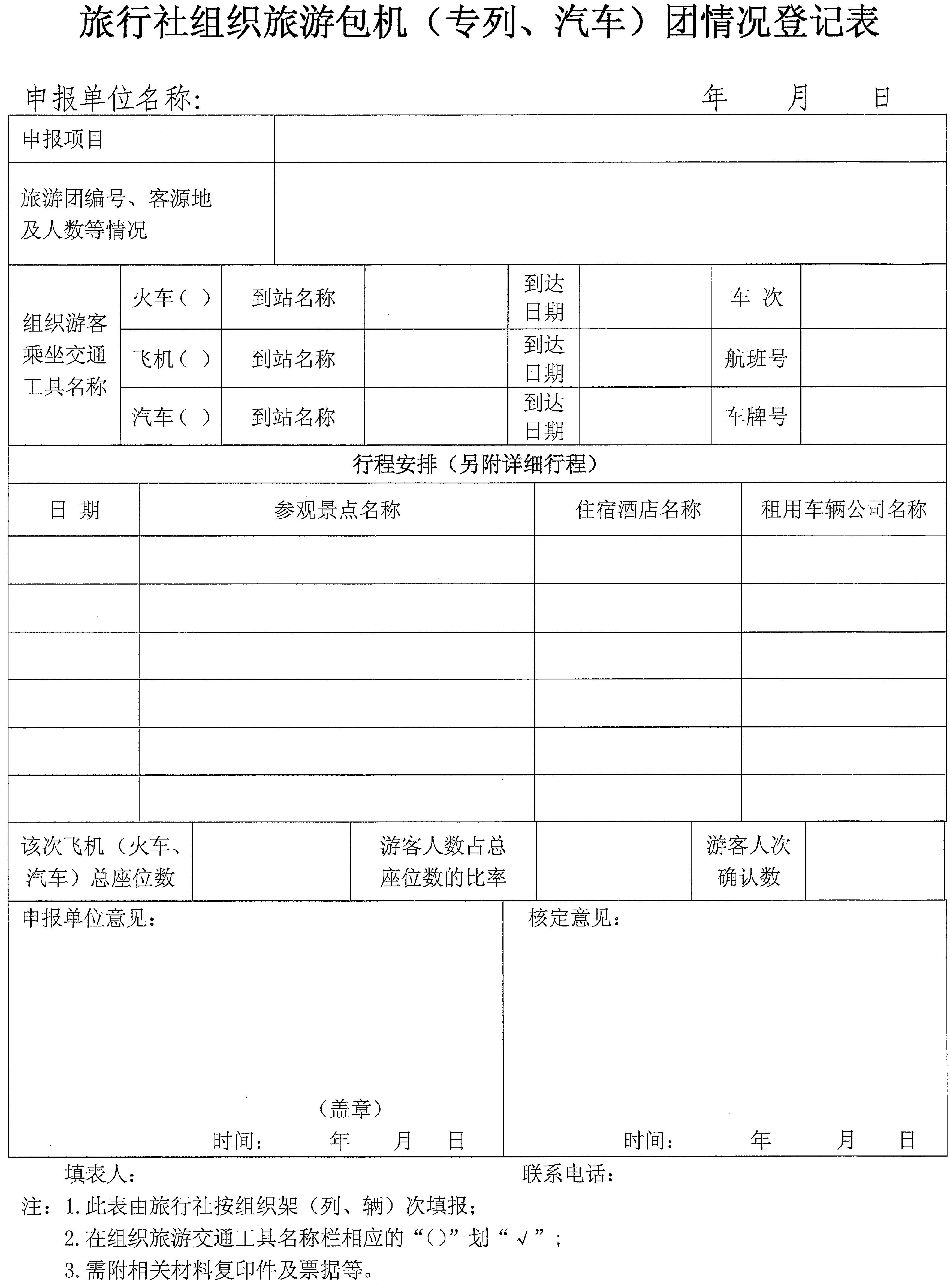 ②《旅行社组织旅游包机(专列、汽车)团情况登记表》;