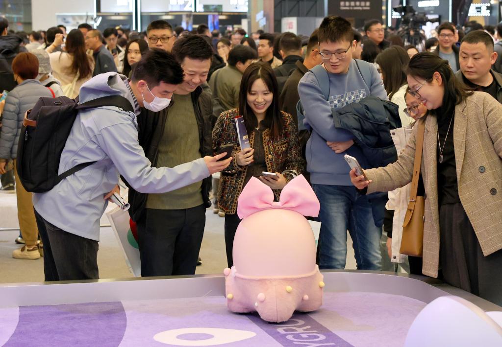 3月20日,参观者在展会上与“Ai Me智能机器人”互动。当日,以“AI科技、AI生活”为主题的2025中国家电及消费电子博览会(AWE2025)在上海新国际博览中心开幕。本届展会吸引全球千余家企业参展,全景展示家电及消费电子领域的前沿成果,呈现AI赋能智慧生活的新产品、新方案、新场景。(新华社记者 方喆 摄)