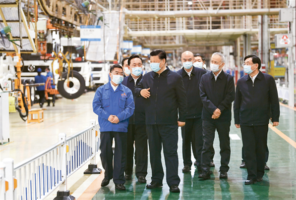 2020年4月20日至23日,中共中央总书记、国家主席、中央军委主席习近平在陕西考察。这是4月22日,习近平在陕西汽车控股集团有限公司总装车间察看生产线,了解产品研发、生产、销售和复工复产情况。 新华社记者 谢环驰/摄